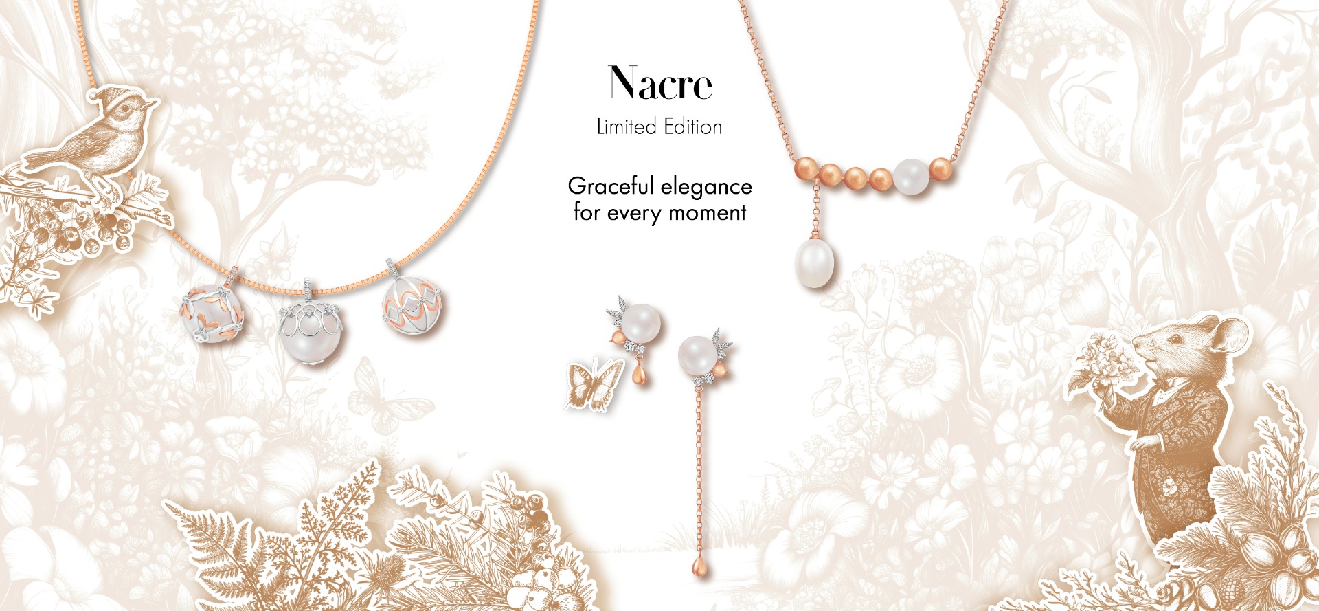 At the heart of this collection are three exquisite pendants, each showcasing the delicate artistry of craftsmanship. Inspired by Christmas tree baubles, these pendants of lustrous pearls are adorned with intricate rose and white gold trellises that capture the magic an enchanting white Christmas.