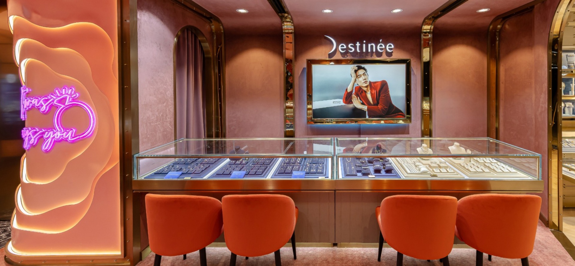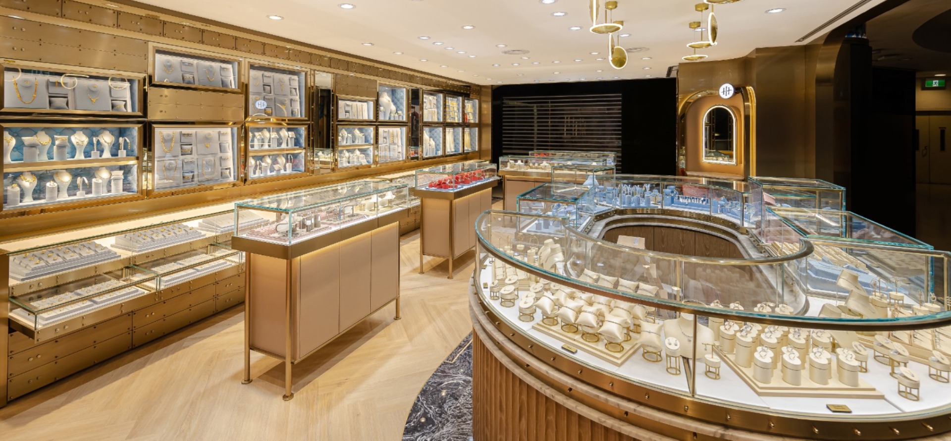 Lining the boutique are gold-accented walls, specially designed to showcase our gold jewellery collections in their best light. This immersive display highlights the radiance of each piece, transforming the space into a gallery of modern elegance.